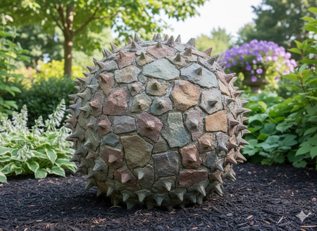 Spherical sculpture made from various natural stones or textured concrete, with individual "spikes" integrated into the surface, mimicking the sweet gum pod's texture and prickly charm. You may find an individual pod setting alone or have a clusters of these Sweet Gum Pods in various sizes (2 feet high to 4 feet high) within a garden mirror how these seeds tumble from the trees and congregate in small groupings.